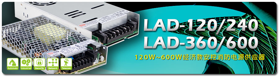 明緯自1982年成立以來,專注于電源供應器本業(yè)并以自有品牌營銷全球80余國,為全球標準電源領導者,在安控消防領域擁有基板型、導軌型、機殼型三種安裝類型可供選用,包含PSC、DRC/DRS、SCP/AD等系列涵蓋35~480W。近年來因城市化發(fā)展需求符合消防法規(guī)、安全可靠、兼具備援、智能監(jiān)控之安控消防電源日益增加,對此,明緯新推出120~600W機殼型經濟款安控消防電源LAD-120/ 240/ 360/ 600系列。